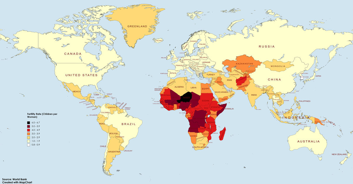 Карта мира по коэффициенту рождаемости: чем светлее, тем ниже рождаемость
