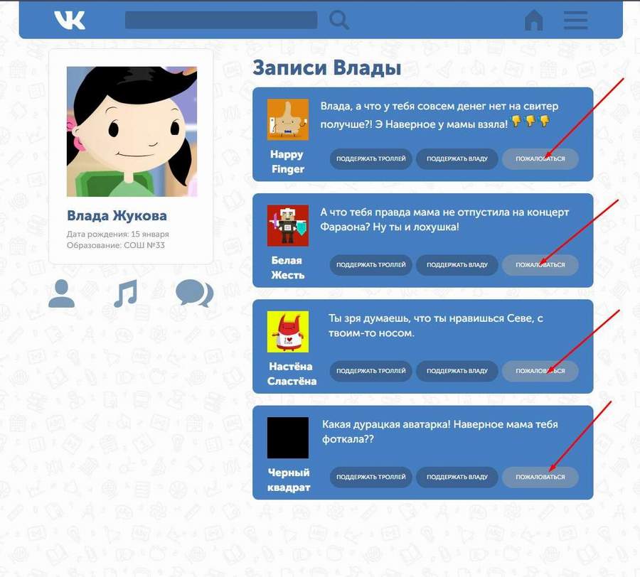 Поскольку вы уже немного разобрались с тем, кто тролль, а кто ваш настоящий друг, вам нужно помочь друзьям проделать то же самое. Итак, первой помощи просит Влада Жукова. Заметьте, что в данном случае не нужно поддерживать Владу, а необходимо сразу жаловаться на троллей, так как общаться с ними не стоит. Это и есть их задача, выманить вас на разговор и осыпать оскорблениями с ног до головы. Сразу жалоба и без промедлений! (смотрите картинку).