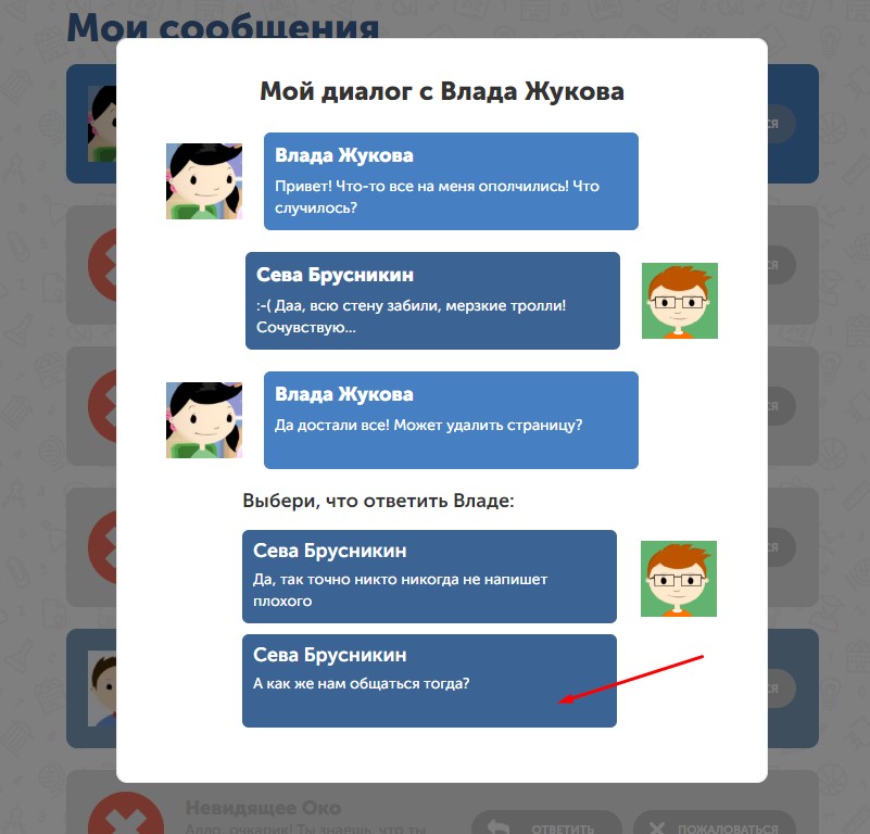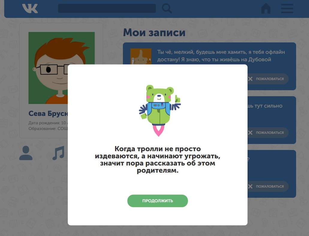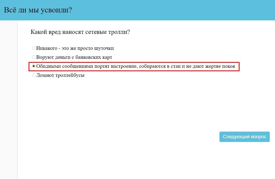 В самом начале первого этапа рассказывается о том, что такое кибербуллинг. Коротко - это травля в сети. Проявляется кибербуллинг в виде злых комментариев, которые высмеивают вас или ваших знакомых, причем делают это совершенно незнакомые вам люди - у всех троллей фейковые аккаунты.
