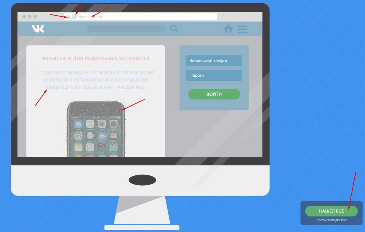 Перед вами изображен компьютер, на котором открыт фиктивный, поддельный сайт, имитирующий популярную сеть Вконтакте. Вам нужно распознать все элементы, выдающие фиктивный сайт - это и ошибки в словах, и неправильный адрес и т.д. Чтобы собрать максимальное количество баллов, повторите все то, что указано на картинке ниже.