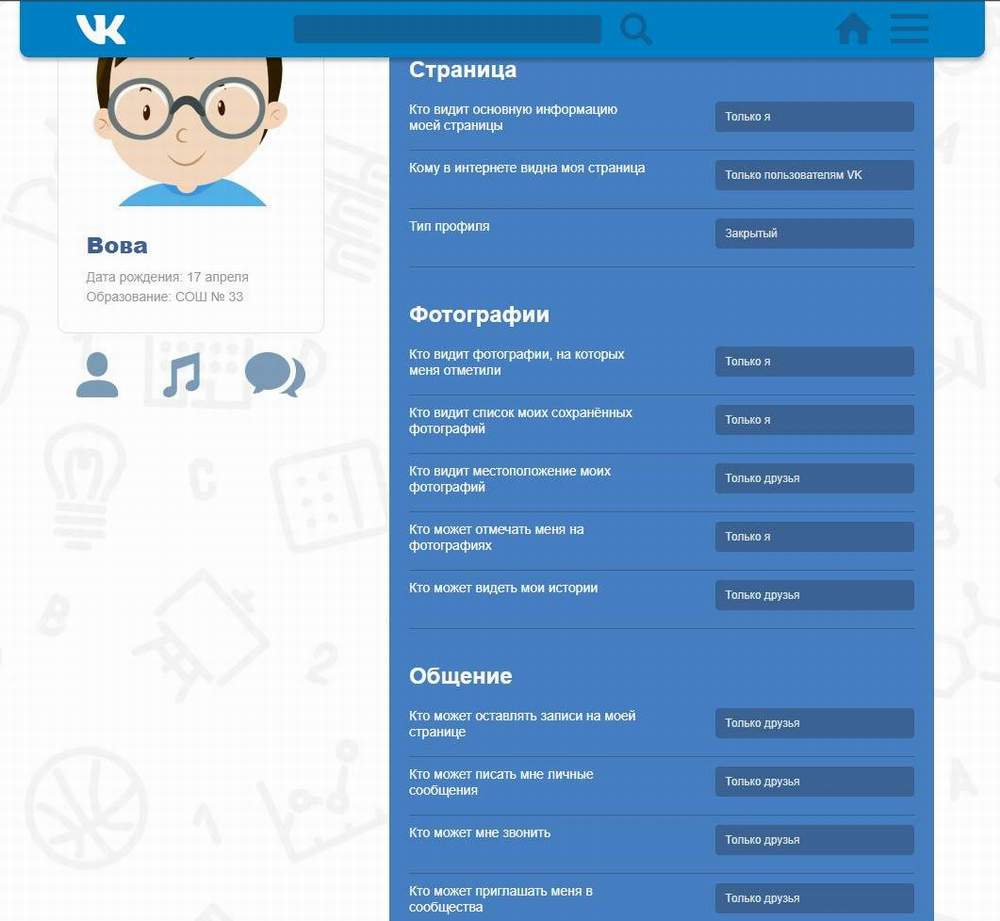 На этом этапе вам нужно помочь друзьям, настроив их "Настройки приватности" во Вконтакте таким образом, чтобы им не смогли писать мошенники или тролли, а также не могли украсть их личные данные или вещи. Настраиваем странички во Вконтакте своих друзей так, как показано на картинках ниже.