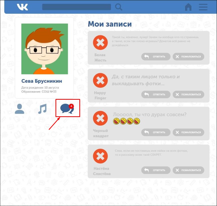 Затем переходим в Личные сообщения и жалуемся на все сообщения, кроме Никиты Войнова - это ваш друг и ему нужно ответить (смотрите картинки).
